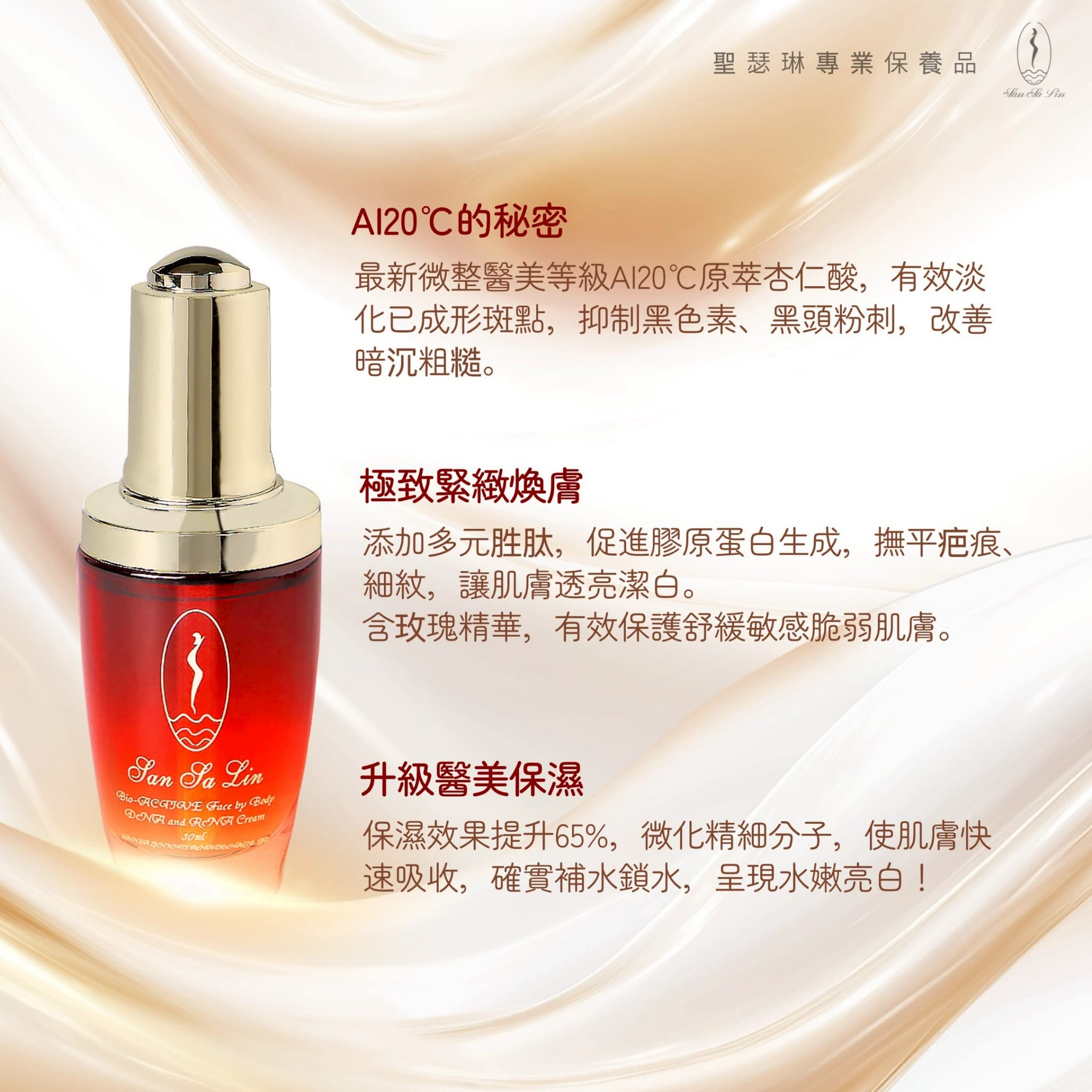 杏仁酸20%、玫瑰精露、胜肽精華、玻尿酸