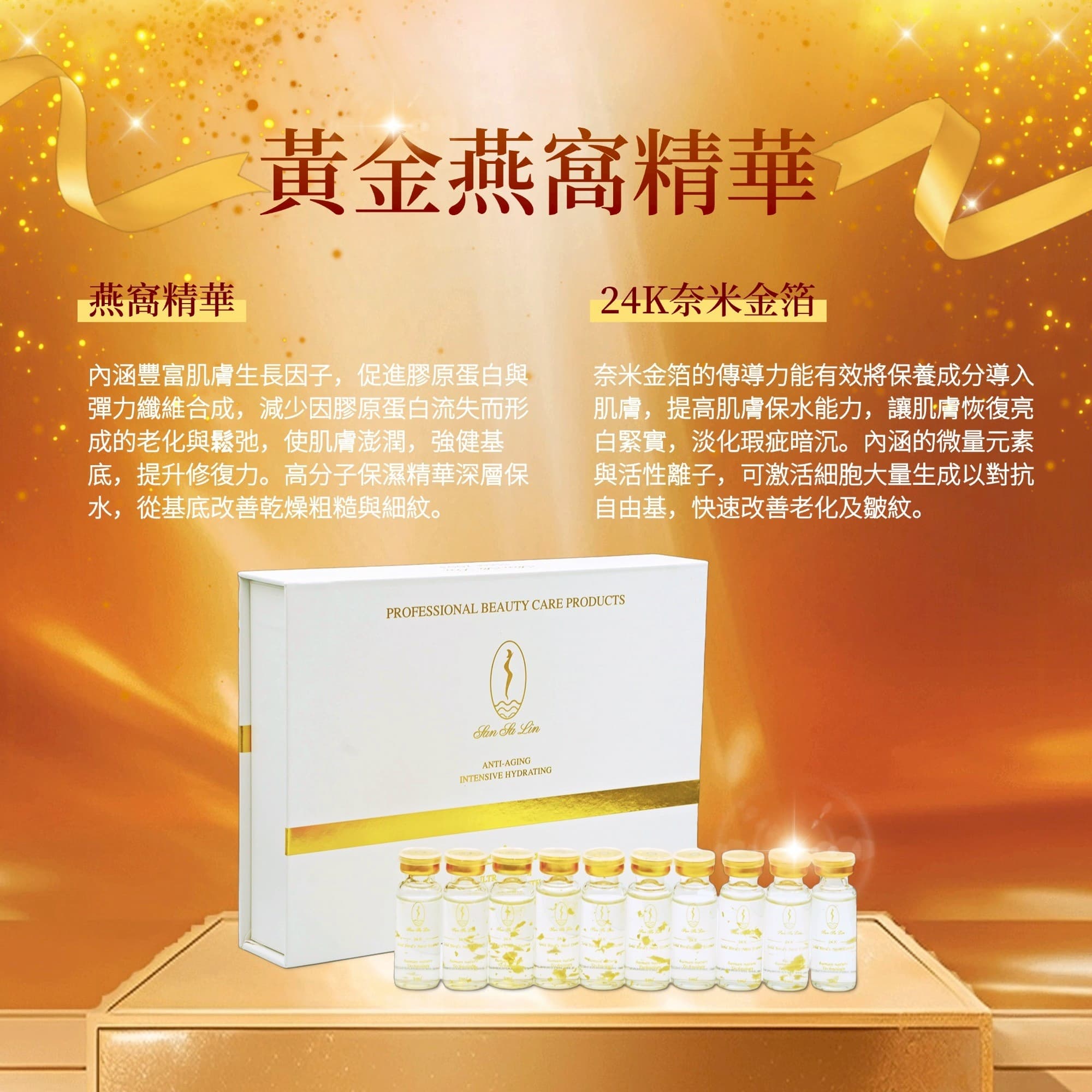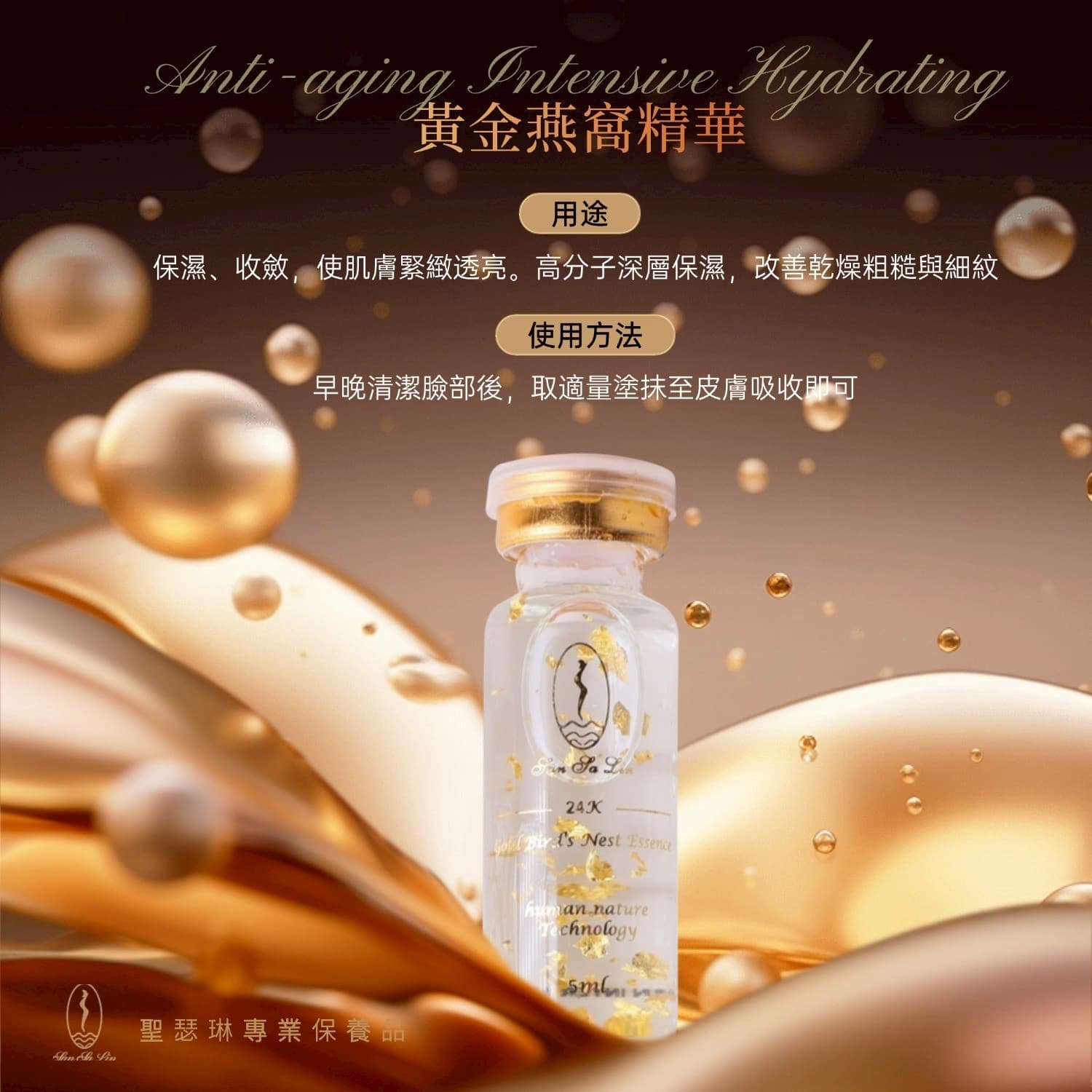 融合燕窩精華與黃金金箔的雙重呵護,高分子保濕精華深入肌底補水鎖水。藉由金箔的優異傳導感,協助肌膚找回緊緻自信,延緩肌膚老化並舒緩乾燥不適,讓肌膚重現細緻飽滿。