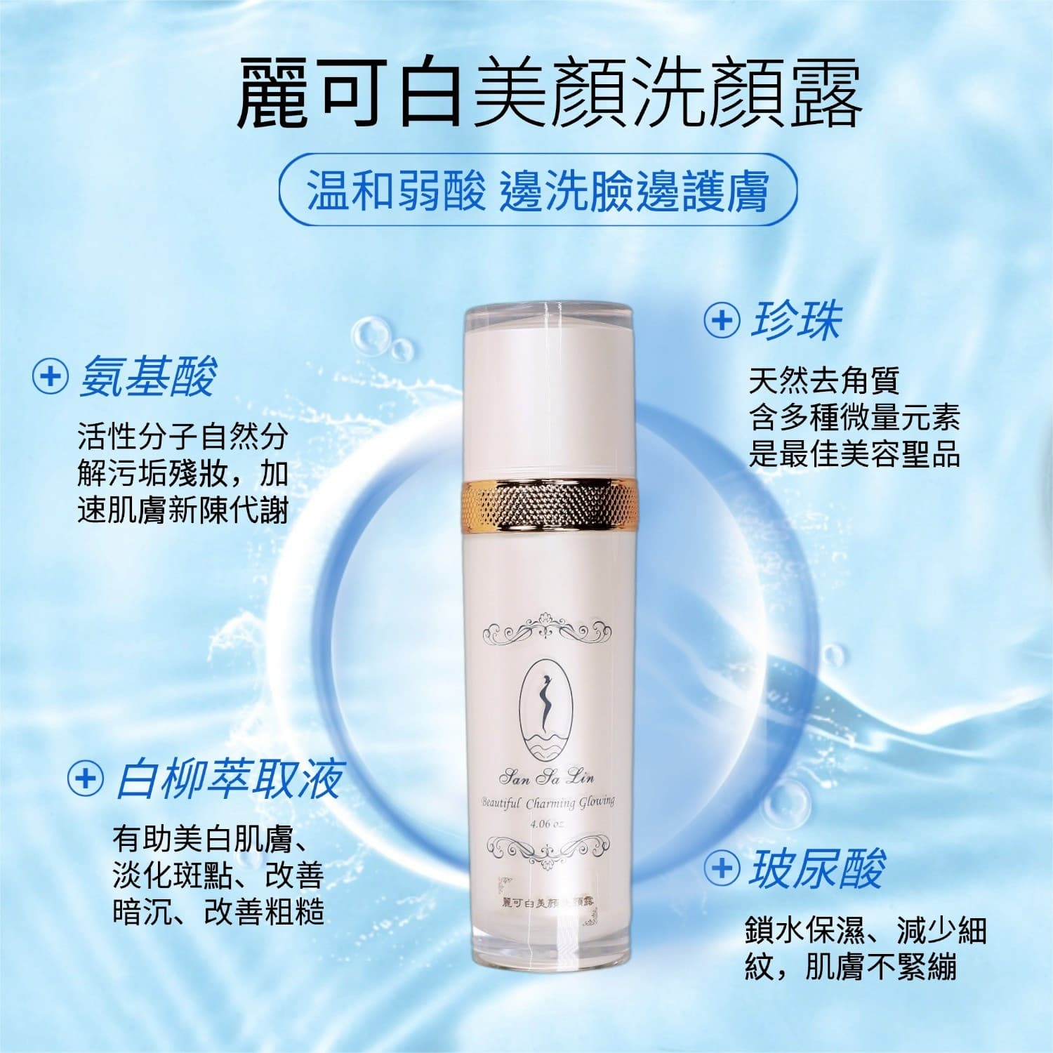 麗可白美顏潔顏露採用親膚弱酸性配方,將潔顏與保養完美結合。細緻的胺基酸泡泡能自然分解污垢與殘妝,搭配天然珍珠精華溫和調理角質,讓肌膚煥然一新。融合白柳萃取液與玻尿酸,在清潔同時層層鎖水,守護洗後的柔嫩膚觸。